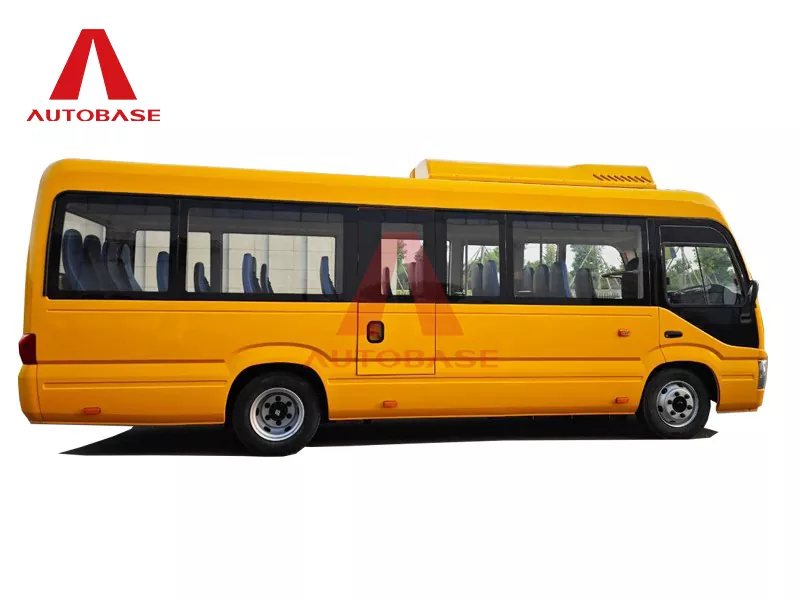 A: Bussen har et kompakt, men rummeligt design med en samlet længde på 7.250 mm (7,2 m) og en bredde på 2.240 mm. Den har et 2+1-sædelayout med en samlet siddeplads på 22 passagerer plus føreren.