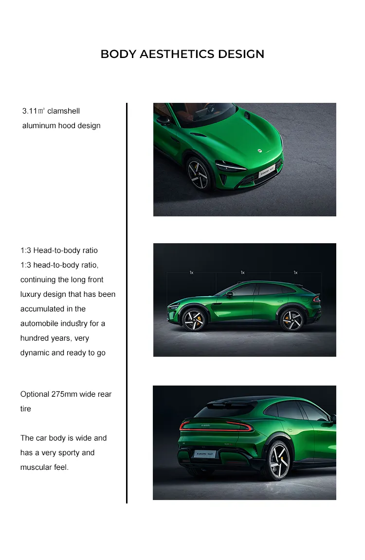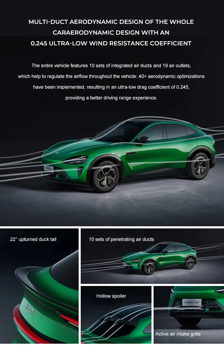 Køretøjet vedtager et slip-back kropsdesign, og forsiden vedtager et lukket design med en krydsformet lysstrimmel. Længden, bredden og højden på hele bilen er 4999*1996*1608 (1600) mm, med en akselafstand på 3000 mm. Siden er udstyret med en rammeløs dør og et skjult håndtagsdesign, som både er smukt og kan reducere vindmodstand. Bilen vedtager et "Sky Screen Panorama Display System" sammensat af tre minilede skærme. Det tre-egne rattet er udstyret med en gearskiftmekanisme, som er praktisk at betjene. Sæderne på bilen er dækket med Nappa-læder, den forreste række er et integreret sportssæde og er udstyret med dobbelt nul-tyngdekraftsæder og 10-punkts massagefunktion. Den bageste række understøtter også 100 ° ~ 135 ° elektrisk poleless justering liggende. Derudover har Xiaomi Yu7 36 opbevaringsrum, inklusive en bagagerum med et volumen på 141L.